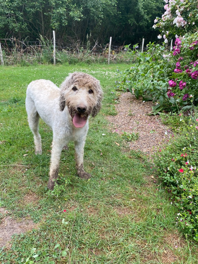 Here is another picture of my very happy Dog but I am less pleased with it as she is happy because, two hours after an expensive groom, she suddenly remembered a bone she’d buried about two years ago. She THOUGHT she may have buried it in our flower bed but wasn’t sure. This is what happened after she’d spent some time checking.