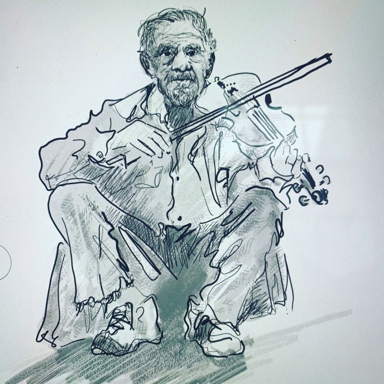 A friend of mine is an Artist and I sent her a story I wrote called ‘Pyotr and Vika’ about a homeless violin player in Moscow. I asked if she wouldn’t mind doing an illustration for it and she sent me this first draft. I absolutely love it – what do you think?