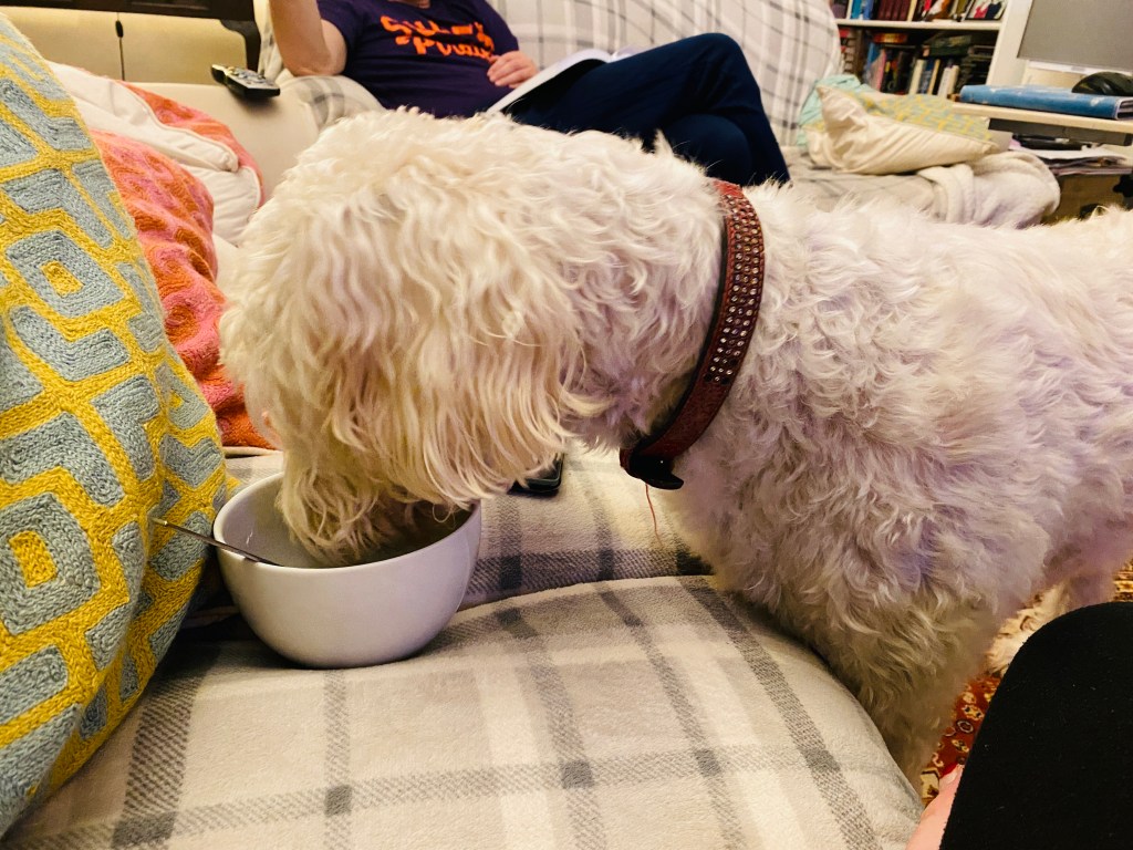Dog, it turns out, adores Greek yoghurt too and watches every mouthful consumed with unnerving intensity. Woe betide anyone who leaves their bowl unattended …