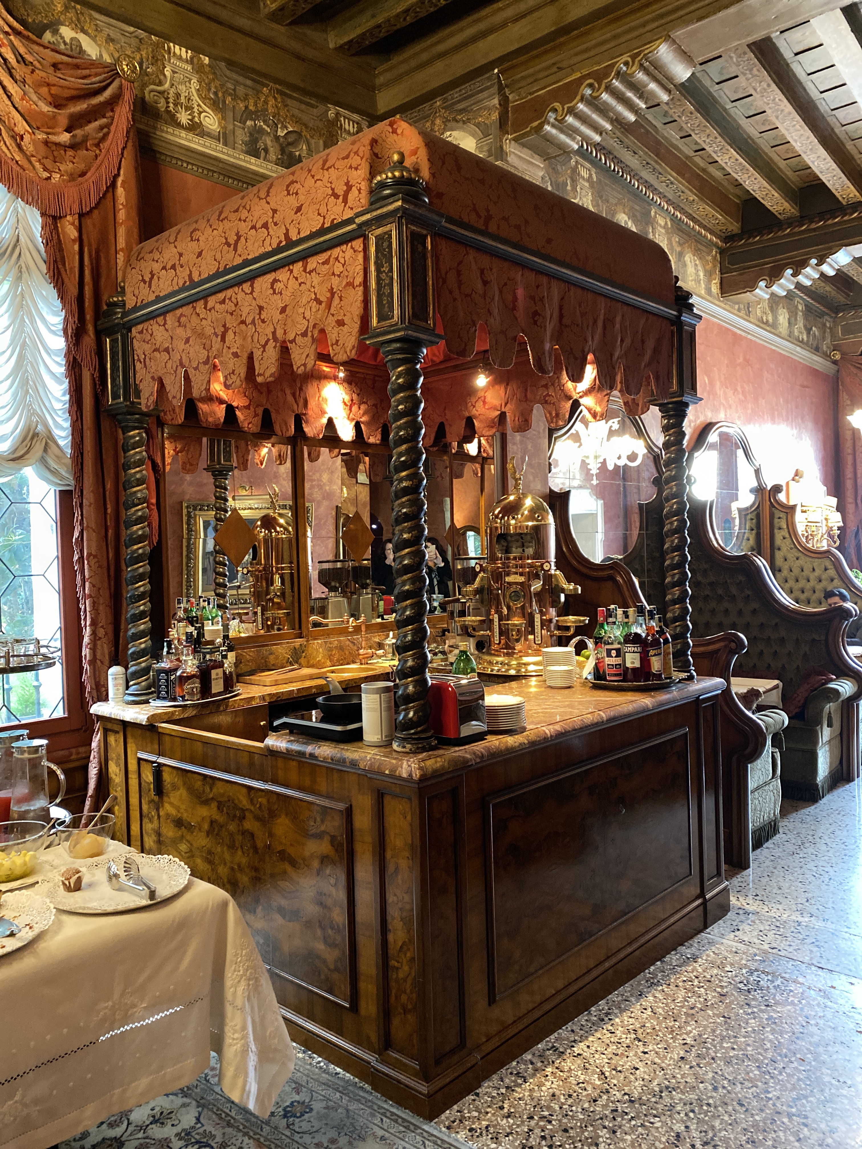It has a dock and the water taxi took us right there where we were met by Tommaso, immaculately dressed in a tailored jacket with pocket square and cravat. Warm, welcoming and knowledgeable, he greeted us by name and showed us around the hotel and made us delicious Aperol Spritzs that he carried out to us on the terrace. Bliss. He reminded me of a character from Dickens.