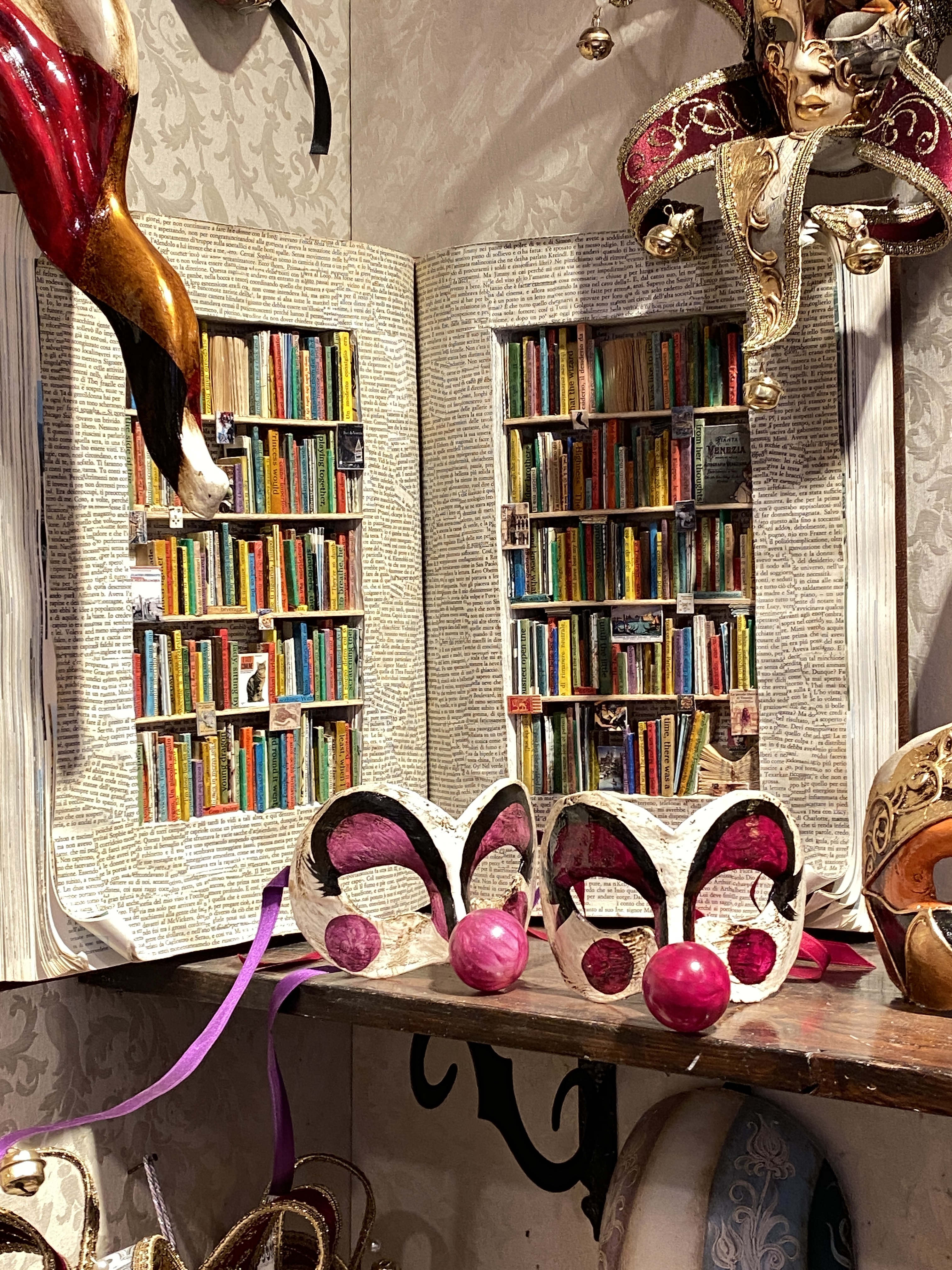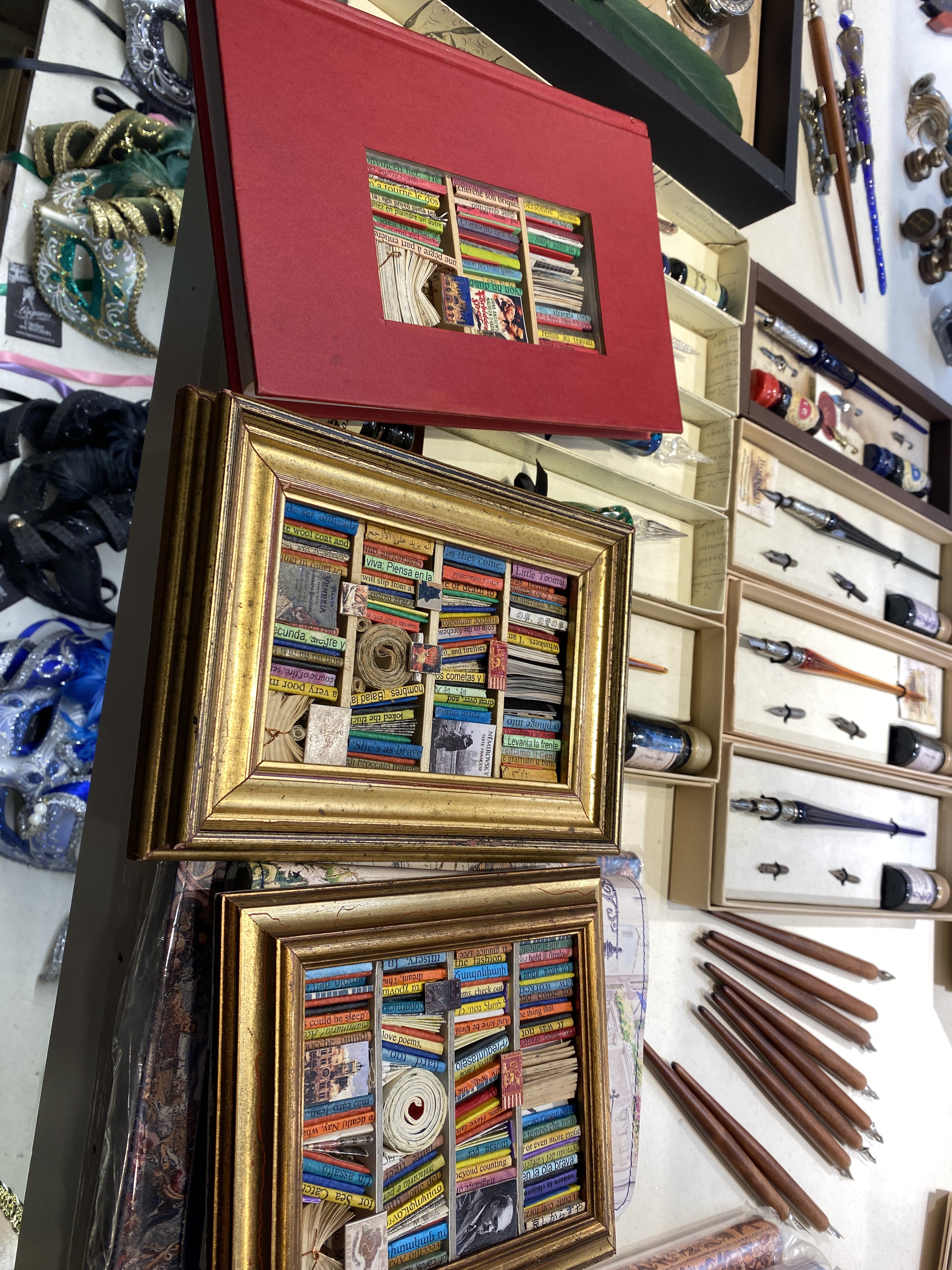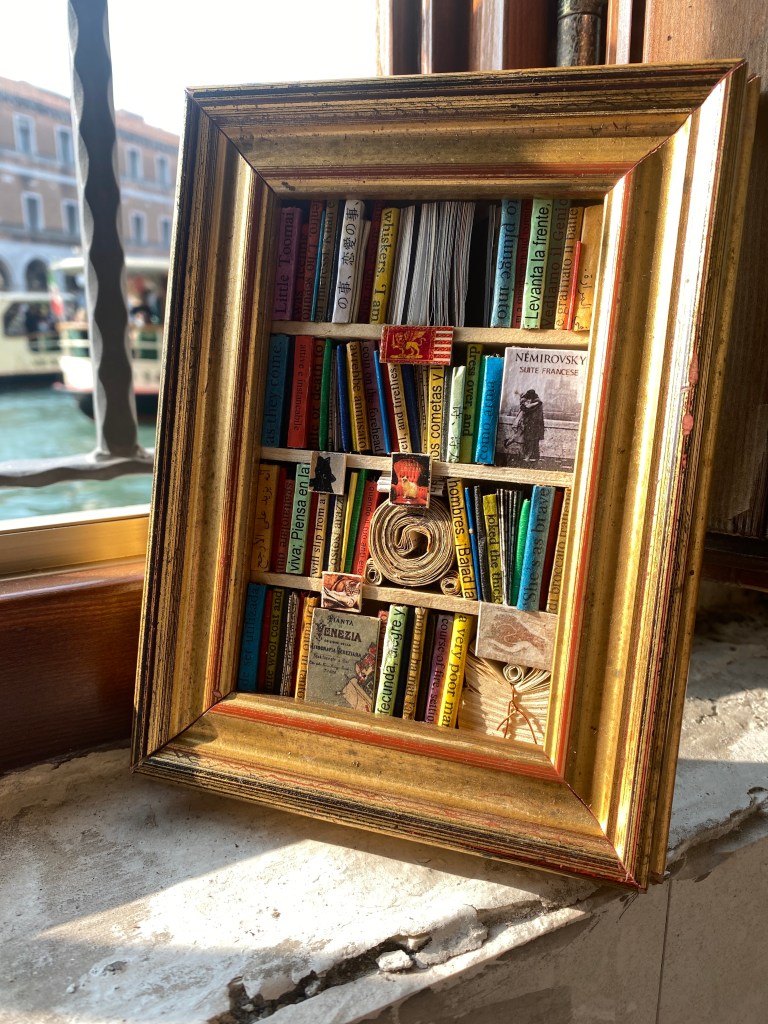 The wonderful Teresa told me all about the Lebanese artist who moved to Venice 30 years ago. He studied architecture at The Università Iuav Di Venezia (I think that’s what she said). He now makes these frames full of piles of paper, postcards of cats and lions, and the spines of books. I absolutely loved them and when I put them on some Facebook Bookgroups, they loved them too! I hope lots of them go and buy them from Teresa.