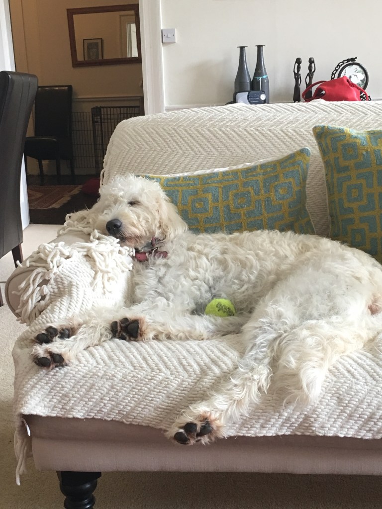 Usually, Dog is a great ball of silvery-white curls – she is often compared to the dog in the Flash advert by admiring passers-by. Well she doesn’t look like that at the moment. Basically she had a very brutal groom – an extremely brutal groom. So brutal I didn’t actually recognise her when I went to collect her. I hadn’t realised how much of her personality was expressed by her eyebrows and whiskers until I saw her after they’d been clipped off. She looked hideous. A gangly, malnourished slink of a thing. The children were horrified when I got her home.